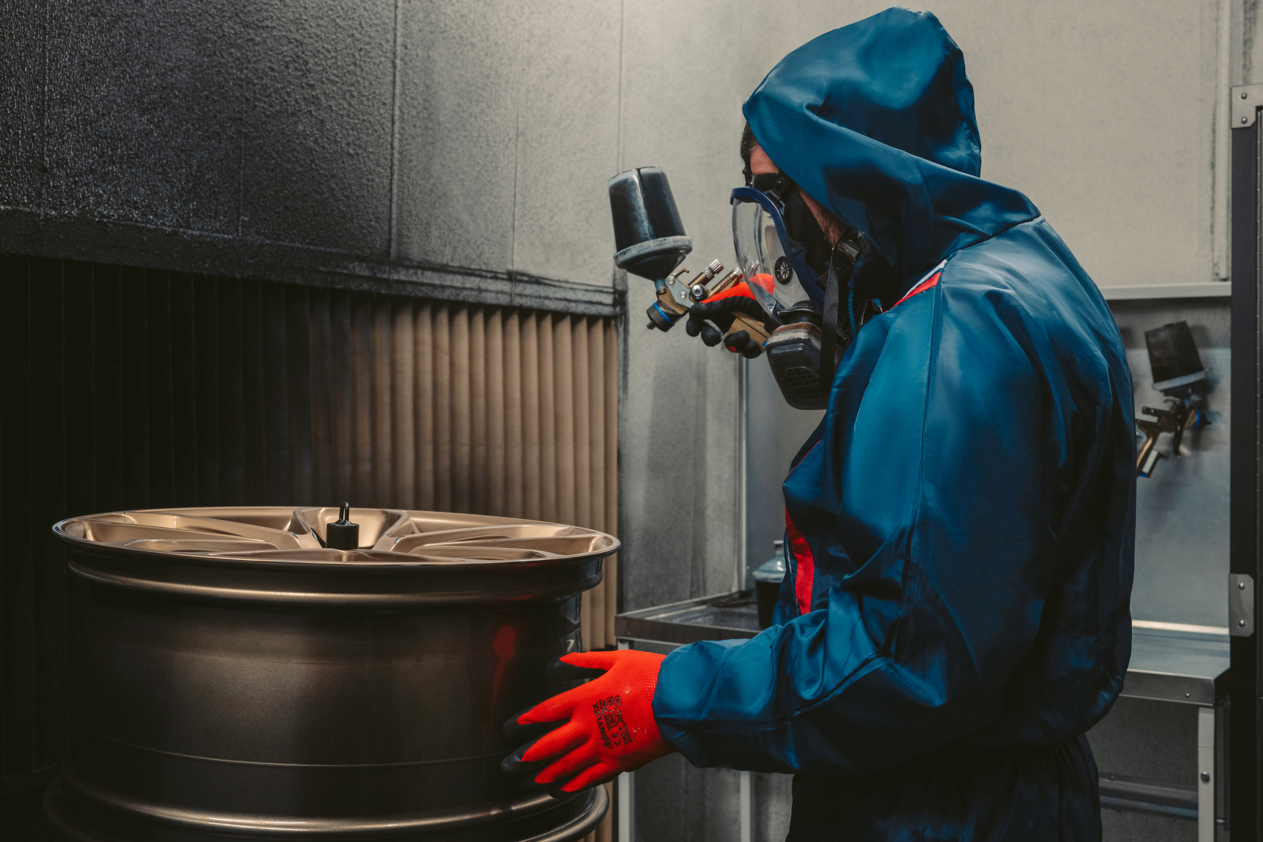So werden die Räder immer im originalen Schichtaufbau hergestellt. Im 3-Schicht Verfahren, bestehend aus Pulvergrundierung, Base-Coat und Acrylpulver, werden Materialien verwendet die untereinander abgestimmt sind.